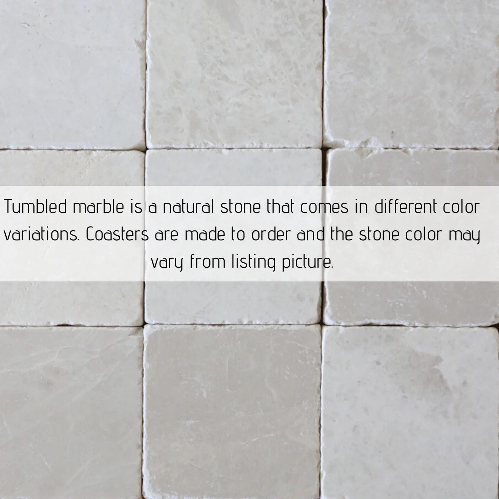 About the stone: These coasters are made from the highest quality natural tumbled natural marble so there will be some color variations, veining, pits and natural tumbled edges. The coasters are made to order and will be based on the coasters photographed but since the marble comes in shades from cream to tan the undertone can vary from the picture.