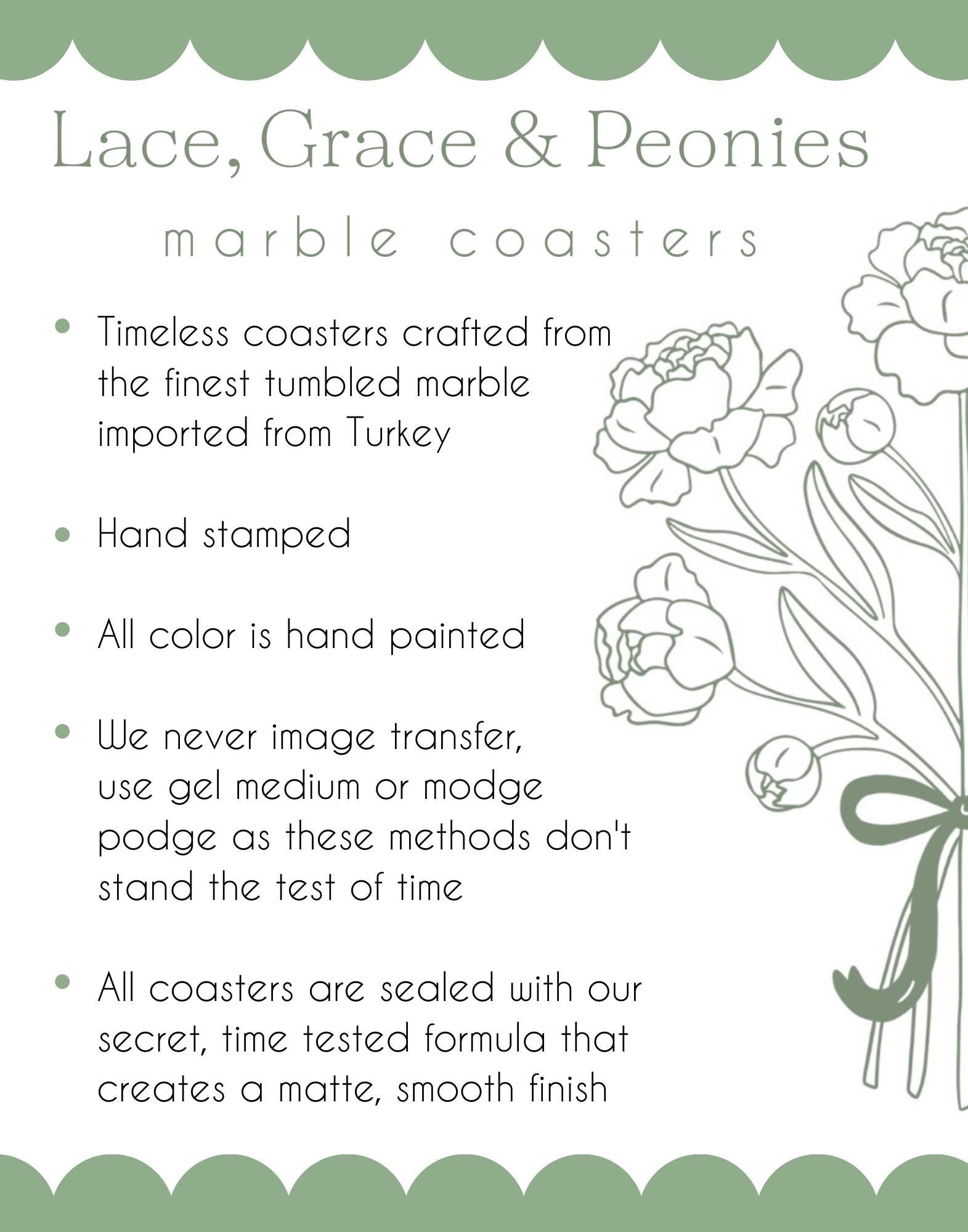 Care Instructions: Due to the handmade nature of the coasters, they are not dishwasher safe. These are for indoor use only, no patios or screened in porches. Please take extra care as excessive scratching or abrasive actions may damage the sealant and the design, including paint.