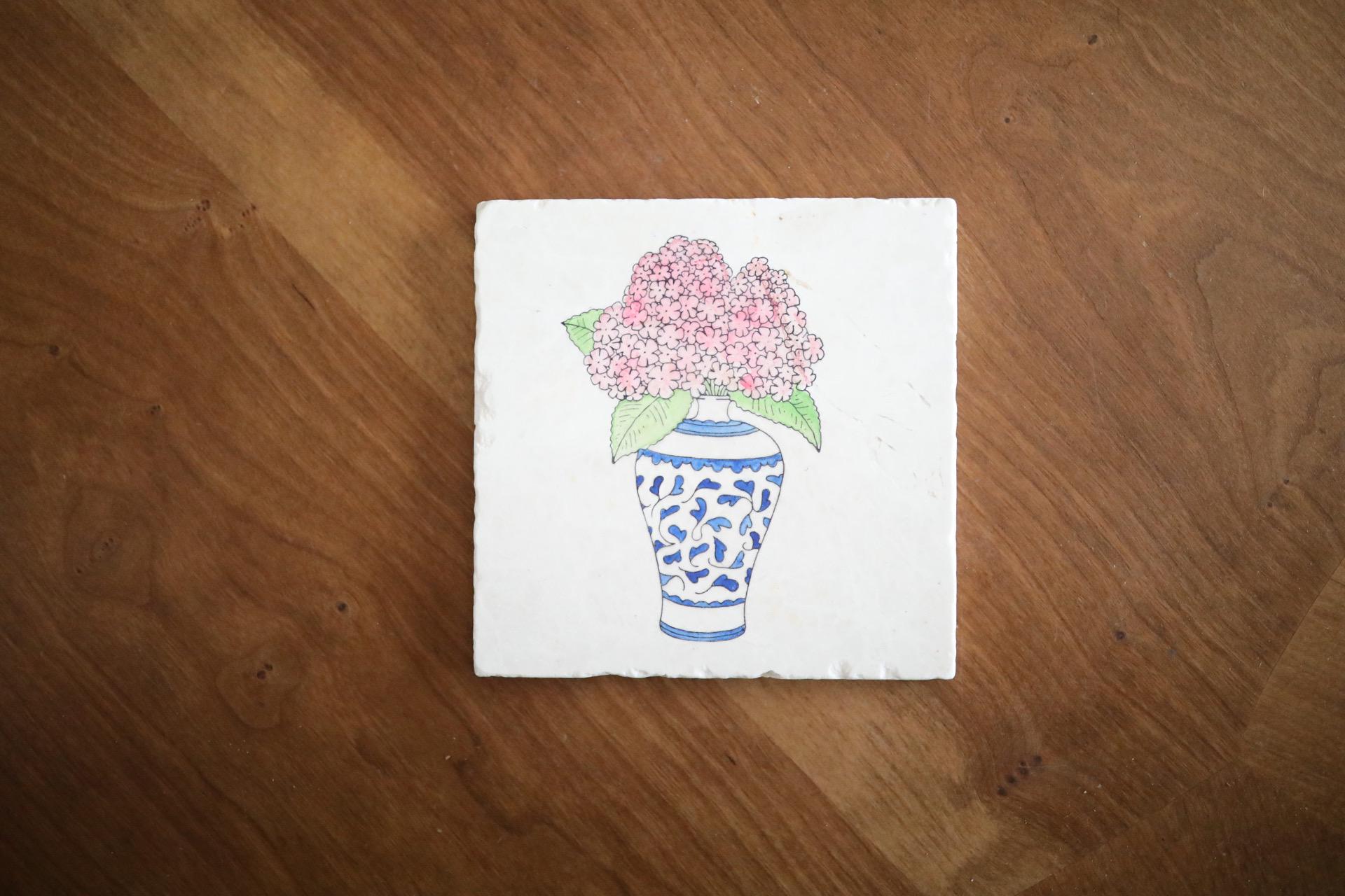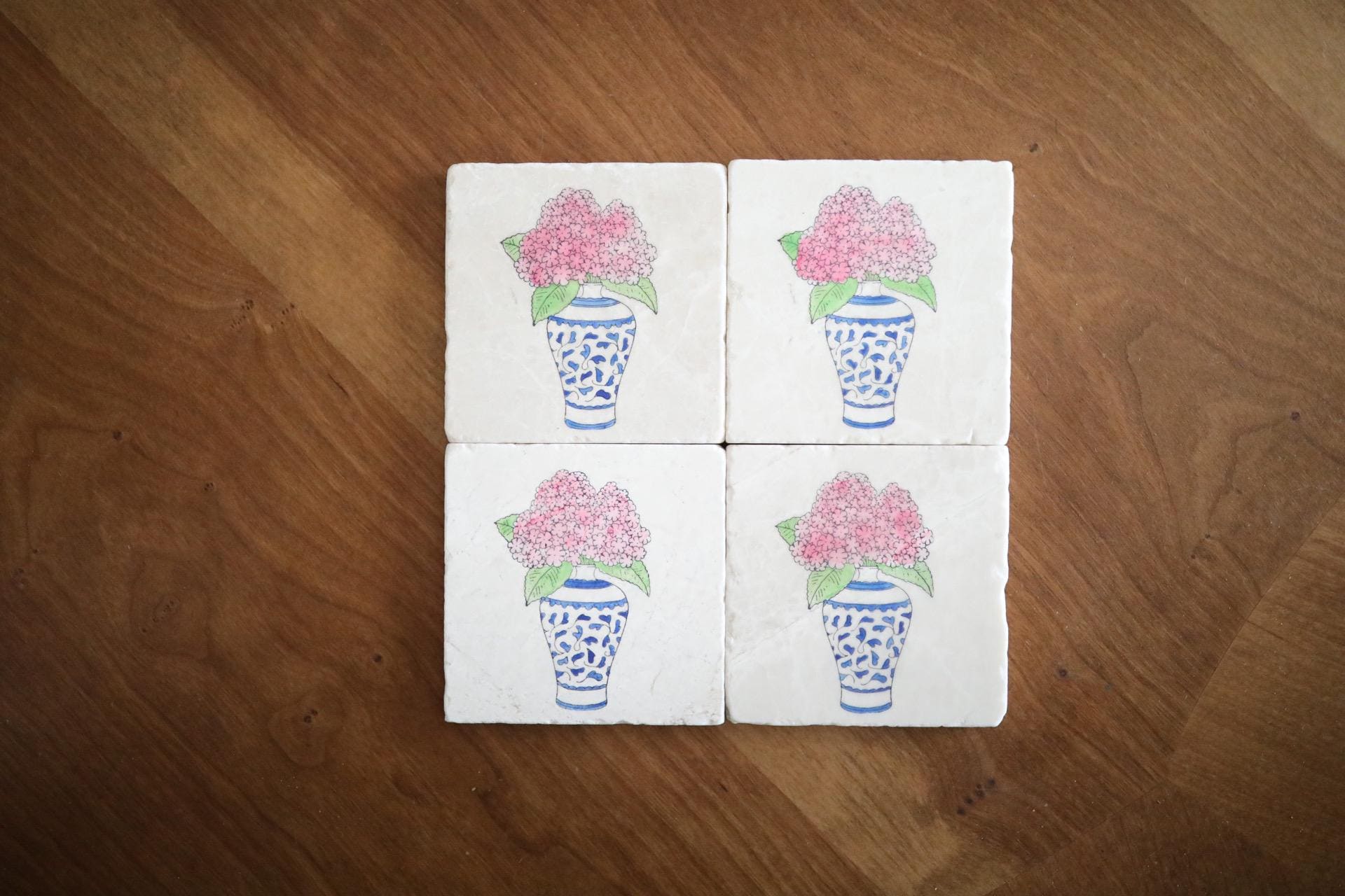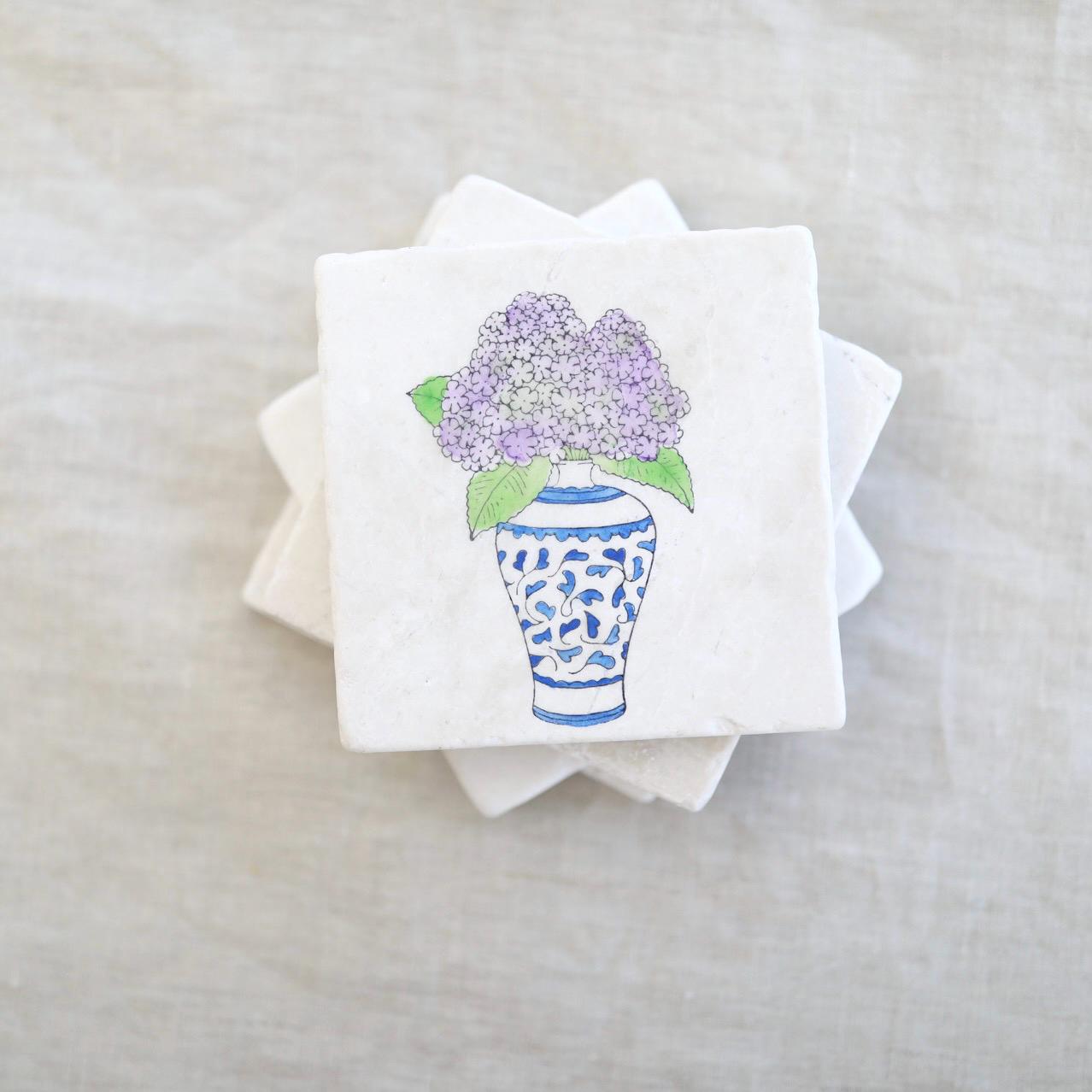 These hand painted ginger jar and hydrangea marble coasters will add flowers that will never die to your coffee table!